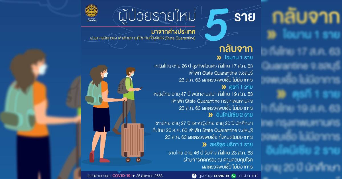 ศบค.เผย ผู้ติดเชื้อโควิดเพิ่ม 5 ราย กลับจากต่างประเทศ ขณะรักษาหายเพิ่ม 7 ราย