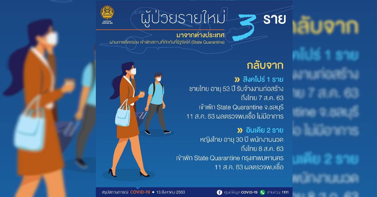 ศบค.เผย ไทยพบผู้ป่วยโควิด-19 รายใหม่เพิ่ม 3 ราย กลับจากสิงคโปร์-อินเดีย